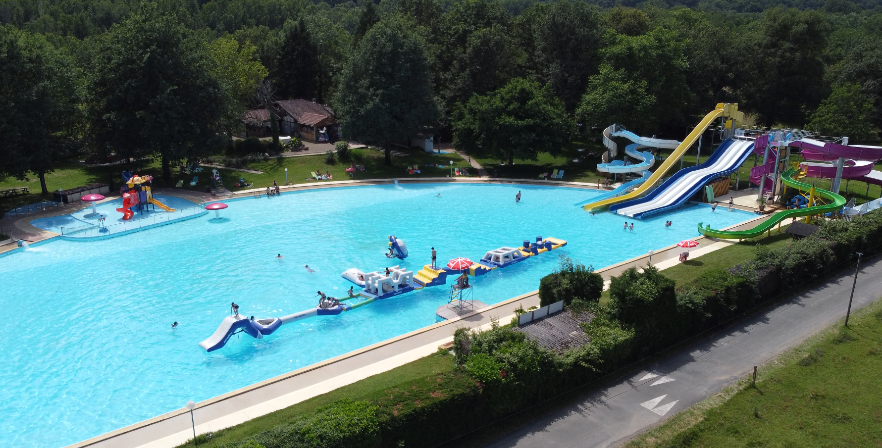 2 500 m2 de baignade surveillée avec 7 toboggans géants, pataugeoire pour enfants, trampoline, jeux gonflables nautiques, esplanade de jets d'eau, tonneau splash, parcours accrogame sécurisé pour les enfants jusqu'à 12 ans. Snack, bar, glaces. Nouveautés : 2 toboggans dont un à bouée ainsi qu'un mini-golf paysager ! Pour 2023, une toute nouvelle pataugeoire plus grande et avec de nouveaux jeux !