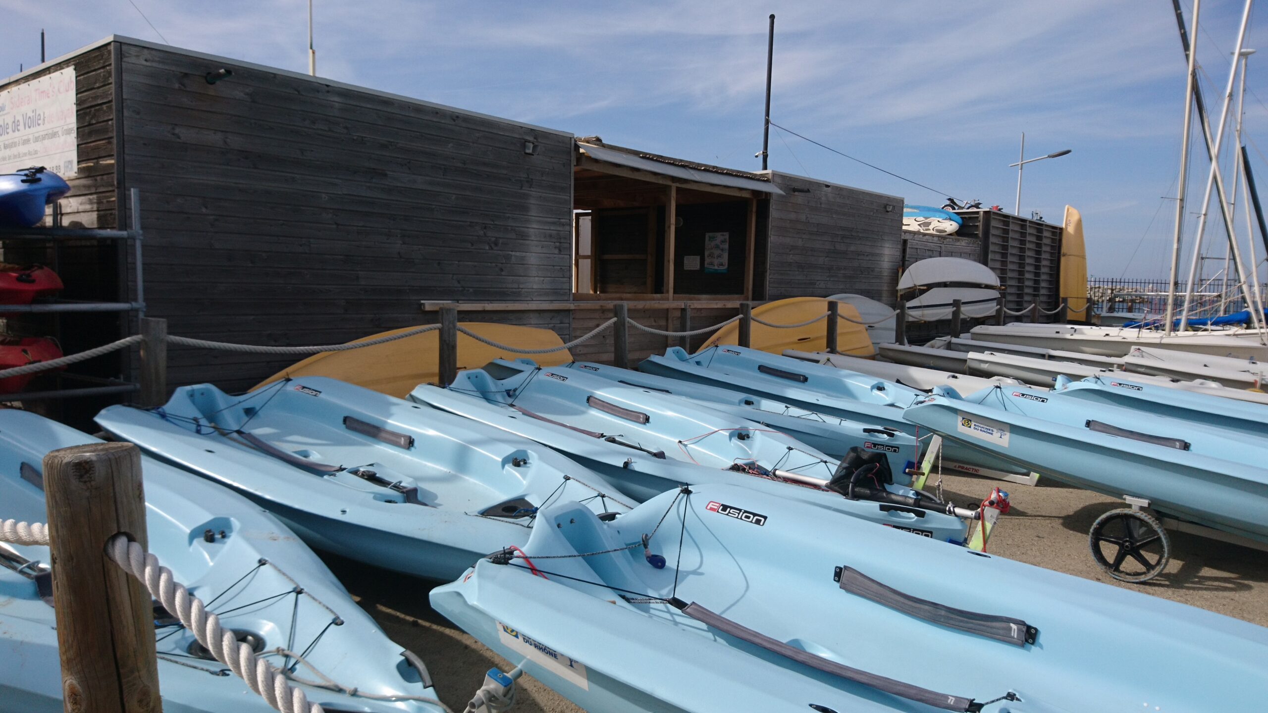 Stockage voile légère et kayak sur parking extérieur sécurisé avec des caméras.