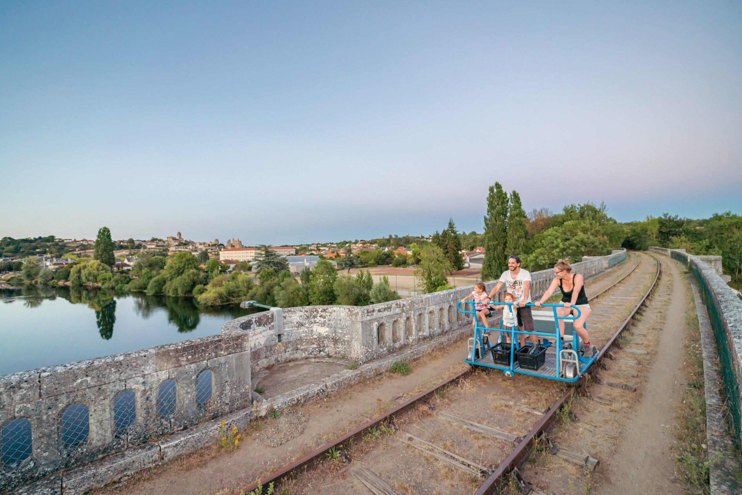 Vous pédalez à travers le bocage vallonné, découvrez à l'aide d'une roadmap le patrimoine de la région, traversez ponts, passerelles et viaducs, dont celui offrant une vue impressionnante des châteaux et de la collégiale Saint-Pierre de Chauvigny. En juillet et août, optez pour les Crépusculaires, au soleil couchant, ou le Dîner du Viaduc, pour un repas dans un cadre exceptionnel au-dessus de la Vienne.