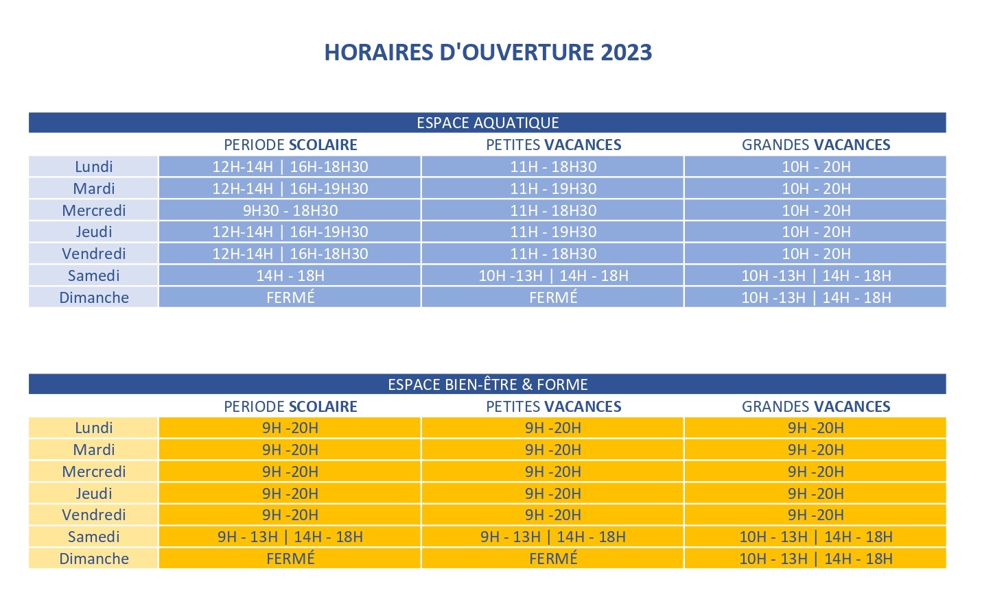 - Espace Aquatique : Bassin sportif intérieur, bassins ludiques intérieur et extérieur, lagunes intérieures et extérieures, pentagliss extérieur, bébé nageur, jardin aquatique, leçons de natation enfants et adultes, aquafitness, aquaphobie.